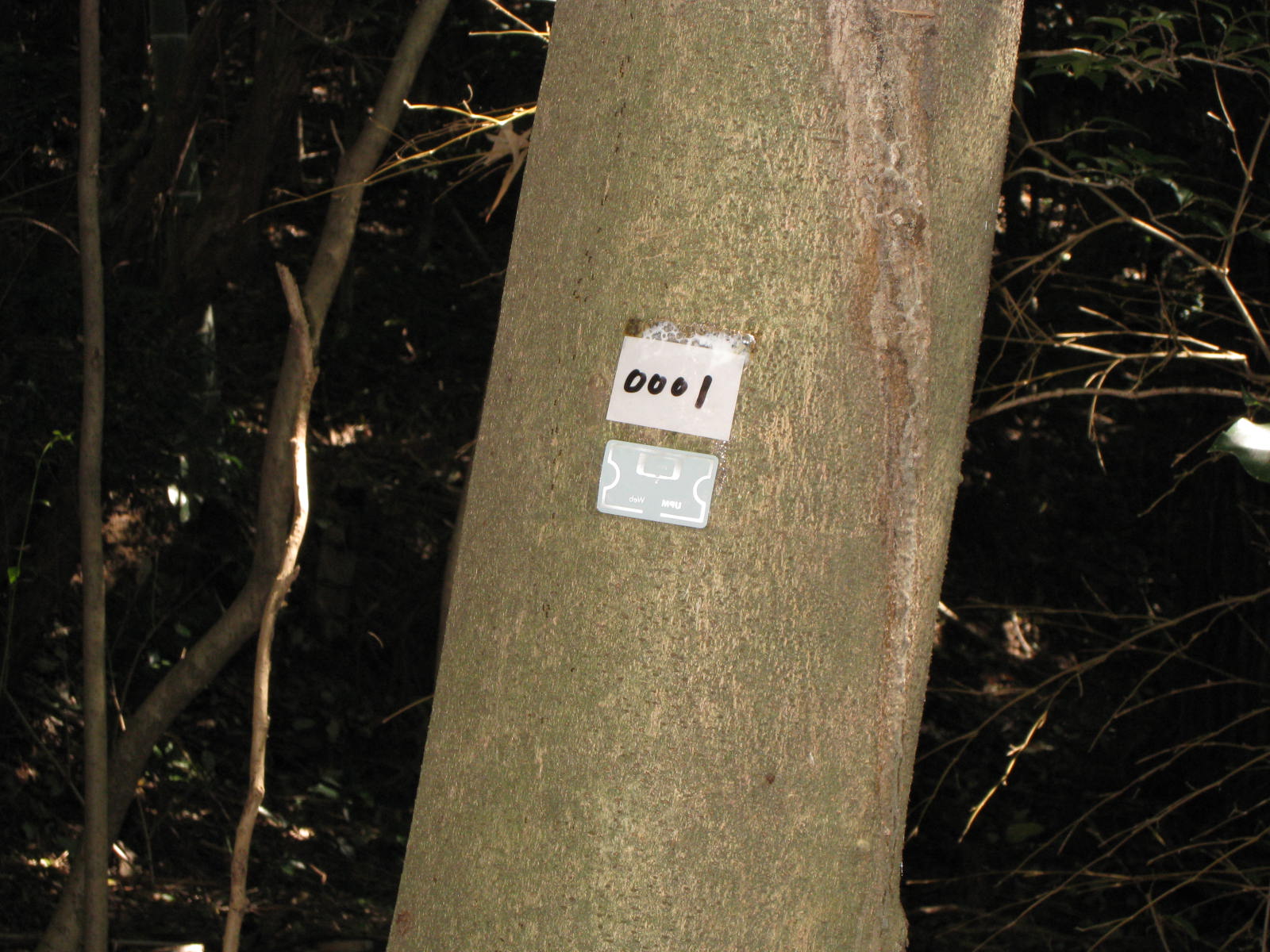 木に取り付けたCタグ。下側がICタグ。