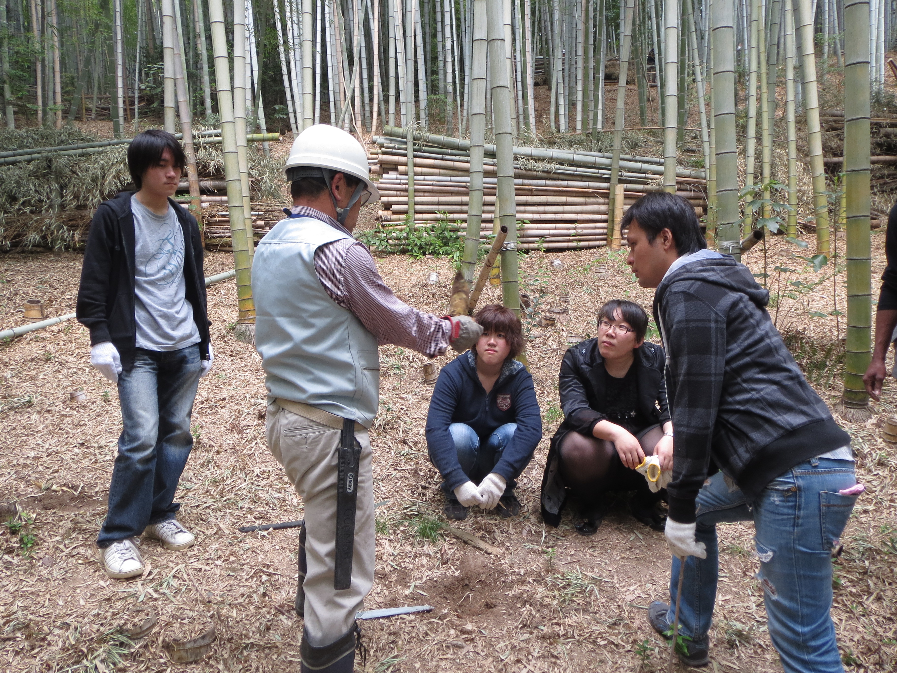 掘りだしたタケノコを示しながら、竹の根の張り方を説明していただいた。