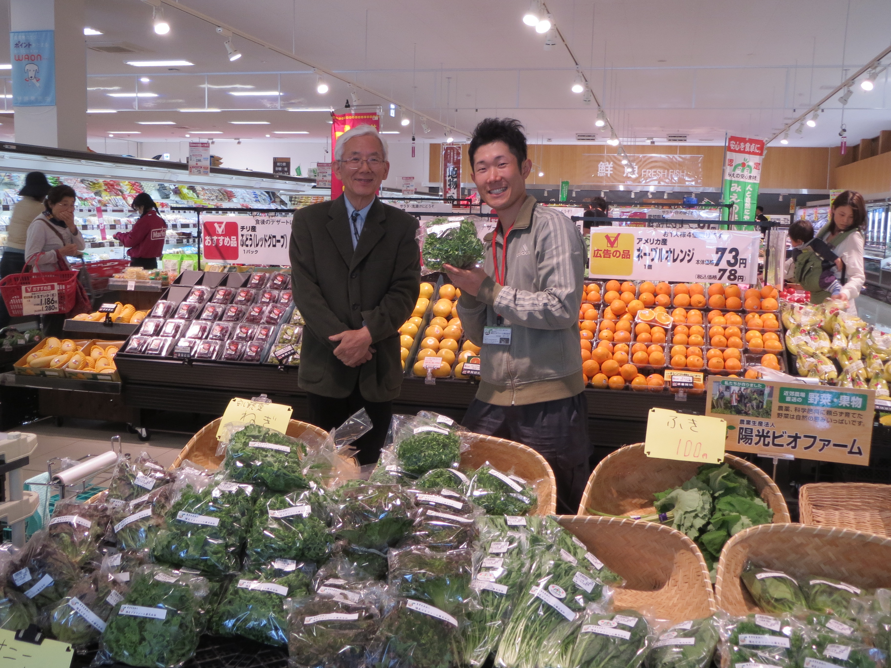 野菜を持って笑顔の谷口君と丸山さん