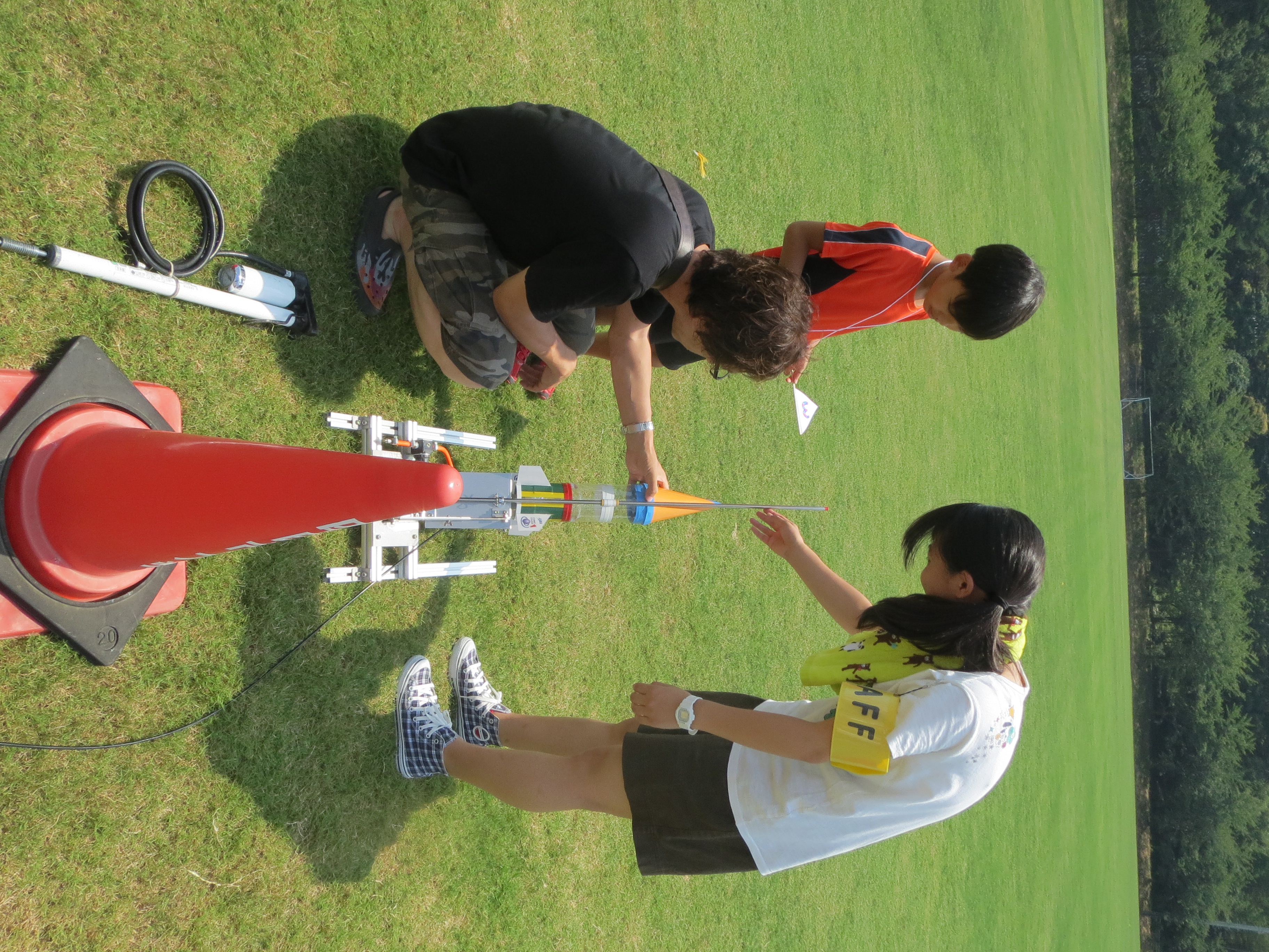 いよいよ発射だ。水ロケットをランチャーに取り付けた。学生スタッフも手伝った。