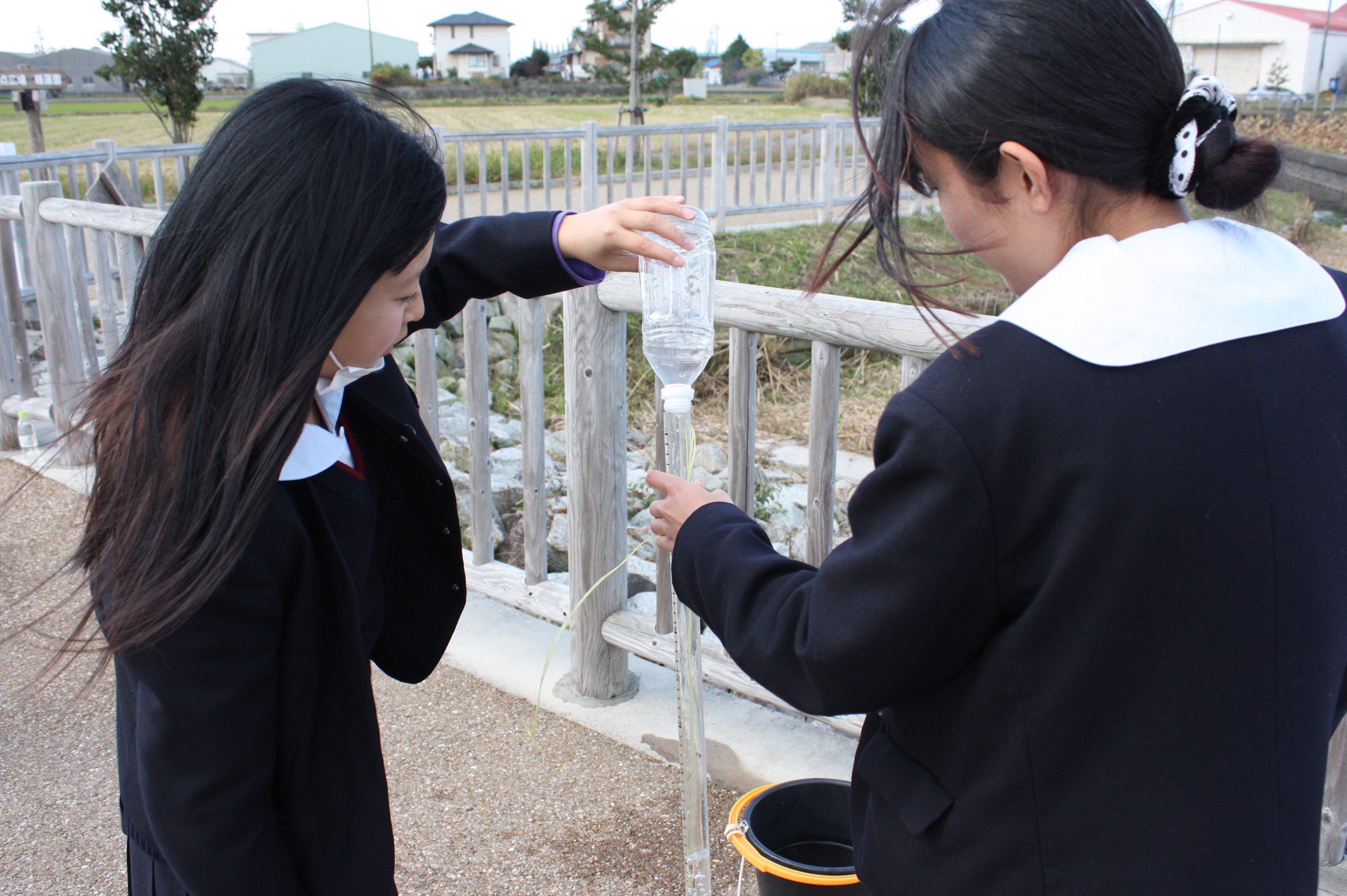 三ツ又池で採取した水を計量する高校生。